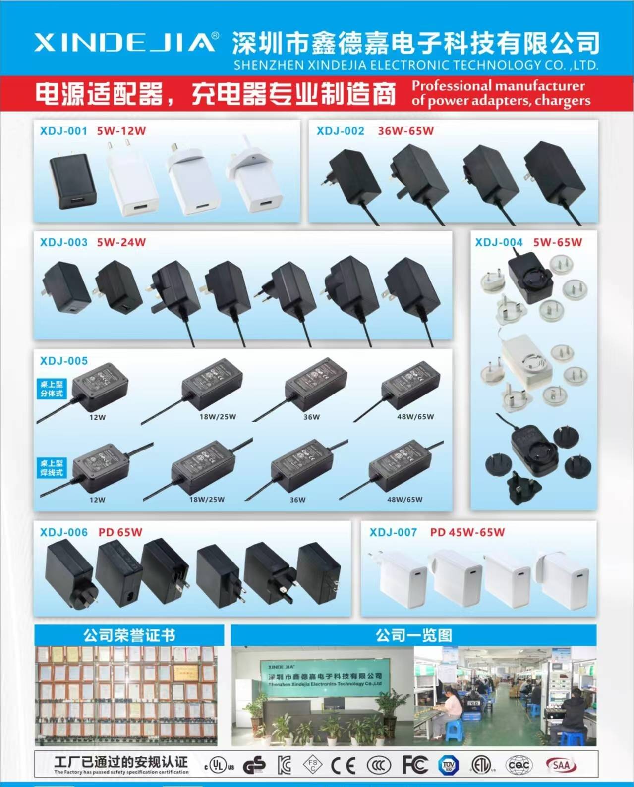 公司主要生产多功能电源适配器、开关电源、充电器、工业电源、广告机电源等产品,是一家专业化的开关电源生产厂家!我们的产品包括:插墙式系列、桌面系列、可换头系列,USB充电器系列、USB智能车充系列,研发团队拥有6人、生产80人、其他人员20人,销售10人组织为一体的高新技术企业,公司拥有一批专业化的研发团队20年电源工作经验、生产设备、精细化的生产工艺流程,人才济济,设备齐全。产品均通过多项质量体系认证,以及诸多项产品安规认证,包括UL,ETL,FCC,CE,CB,GS,CCC、CQC,PSE.KC.KCC,SAA,RCM等。针对品质,鑫德嘉建立了严格的品质管理体系,对品控与技术创新,鑫德嘉还建立了可靠性试验室,可针对电源适配器的性能、物料和结构展开各项行业及国际标准的可靠性试验,保证给每一位客户提供的都是品质可靠的产品。