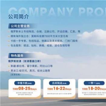 主营: 卡航一手庄家,双清包税,白关,陆运,空运,铁路,海外仓(FBO/FBS),中俄贸易服务,