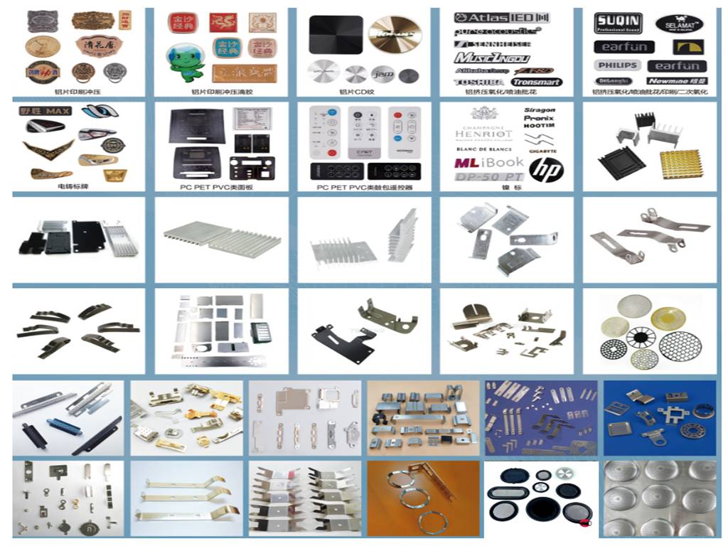 (外观)·CD纹·橡胶振膜·酒 标·镍标·滴胶·PC面板PET面板·标牌·铭板·铭牌·(内构)铝合金散热器·弹片·金属网片·开关弹簧·散热器·五金冲压件·圆柱销·连接片·电池座·配重块·电池弹片·风扇支架·搓花轴·灯扣·车载充电器弹片
