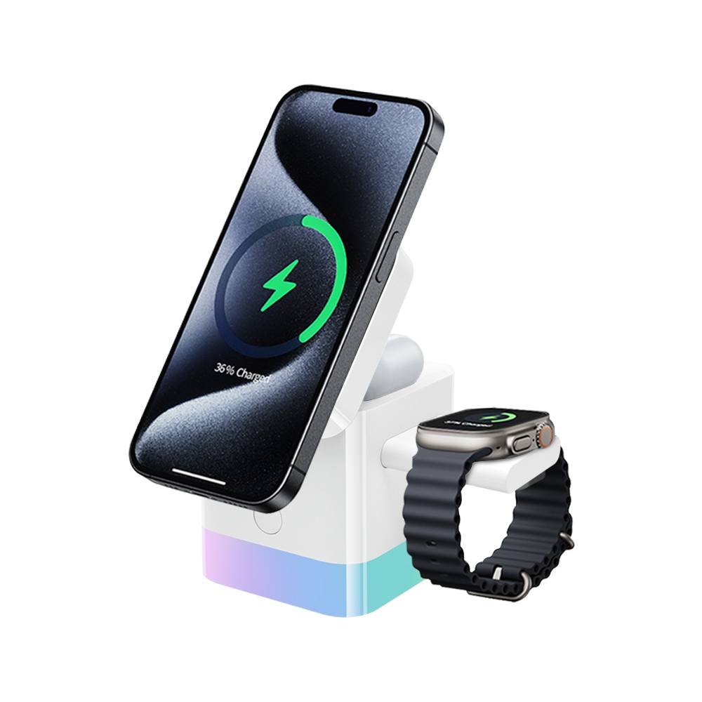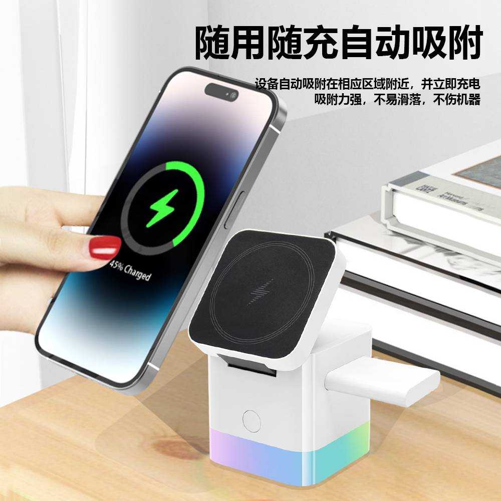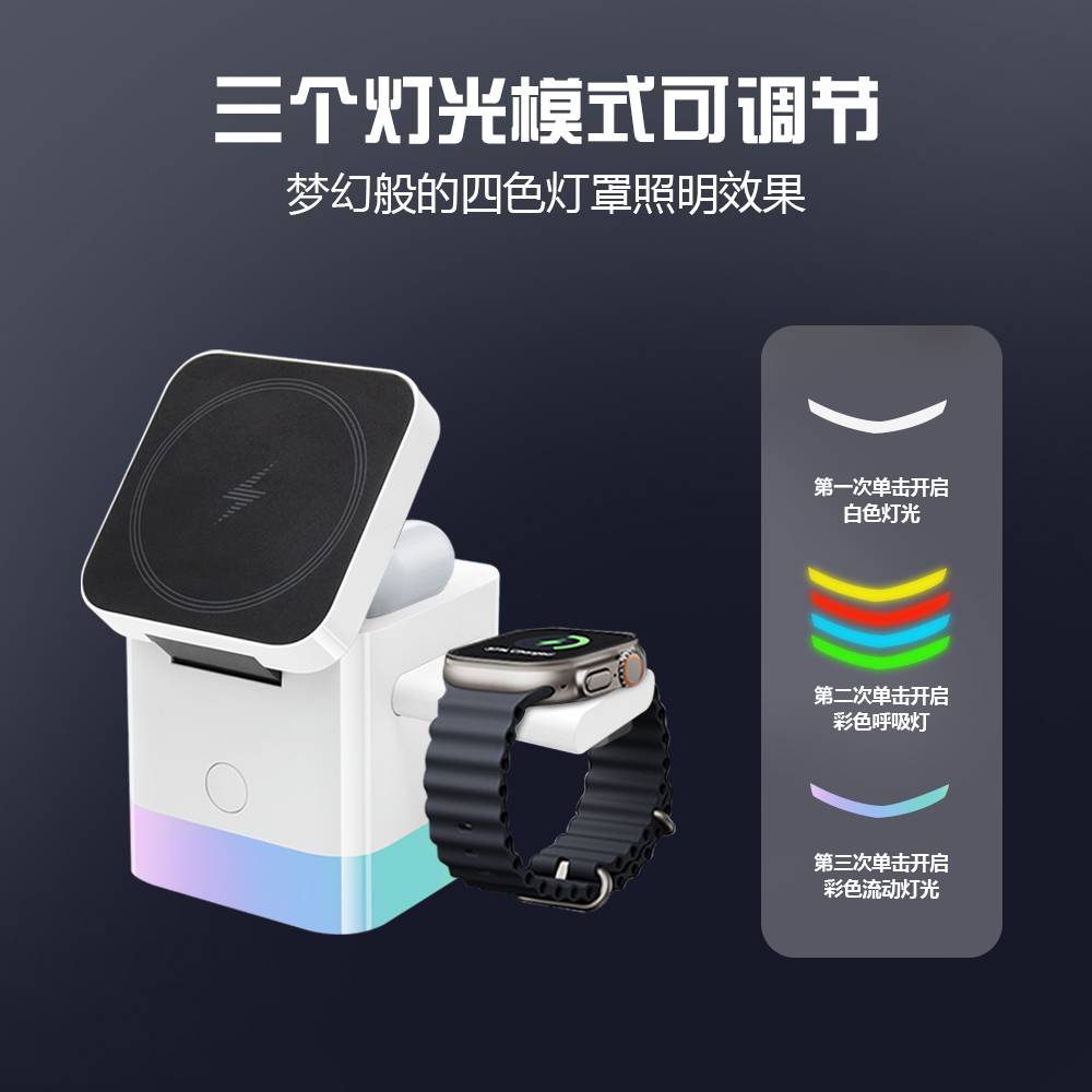 多合一磁吸无线充电器,可以充手机、耳机、手表,带变色小夜灯功能
