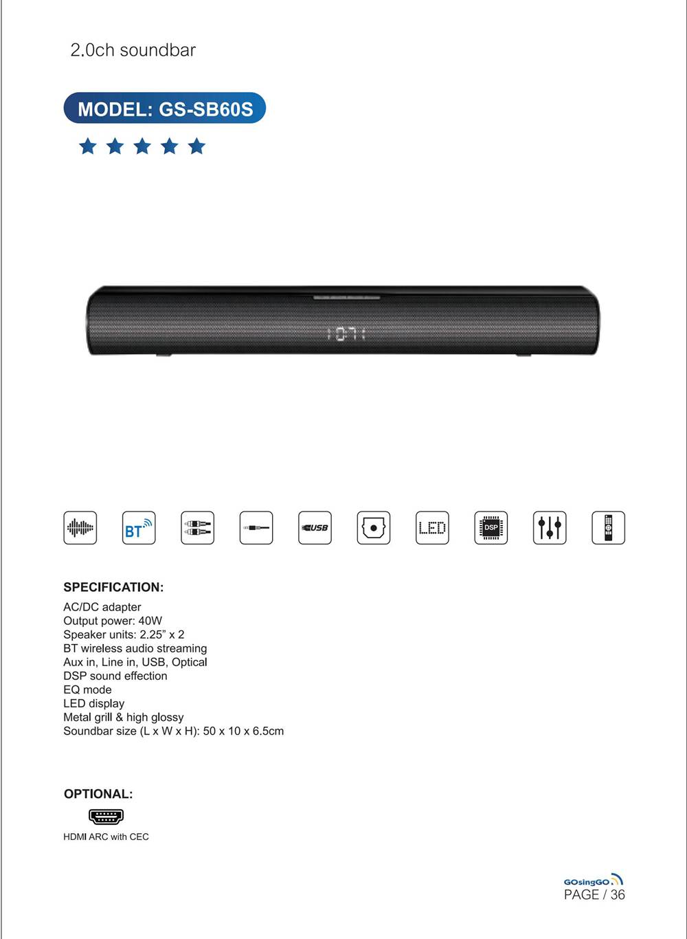 2.0条形音箱 GS-SB60S