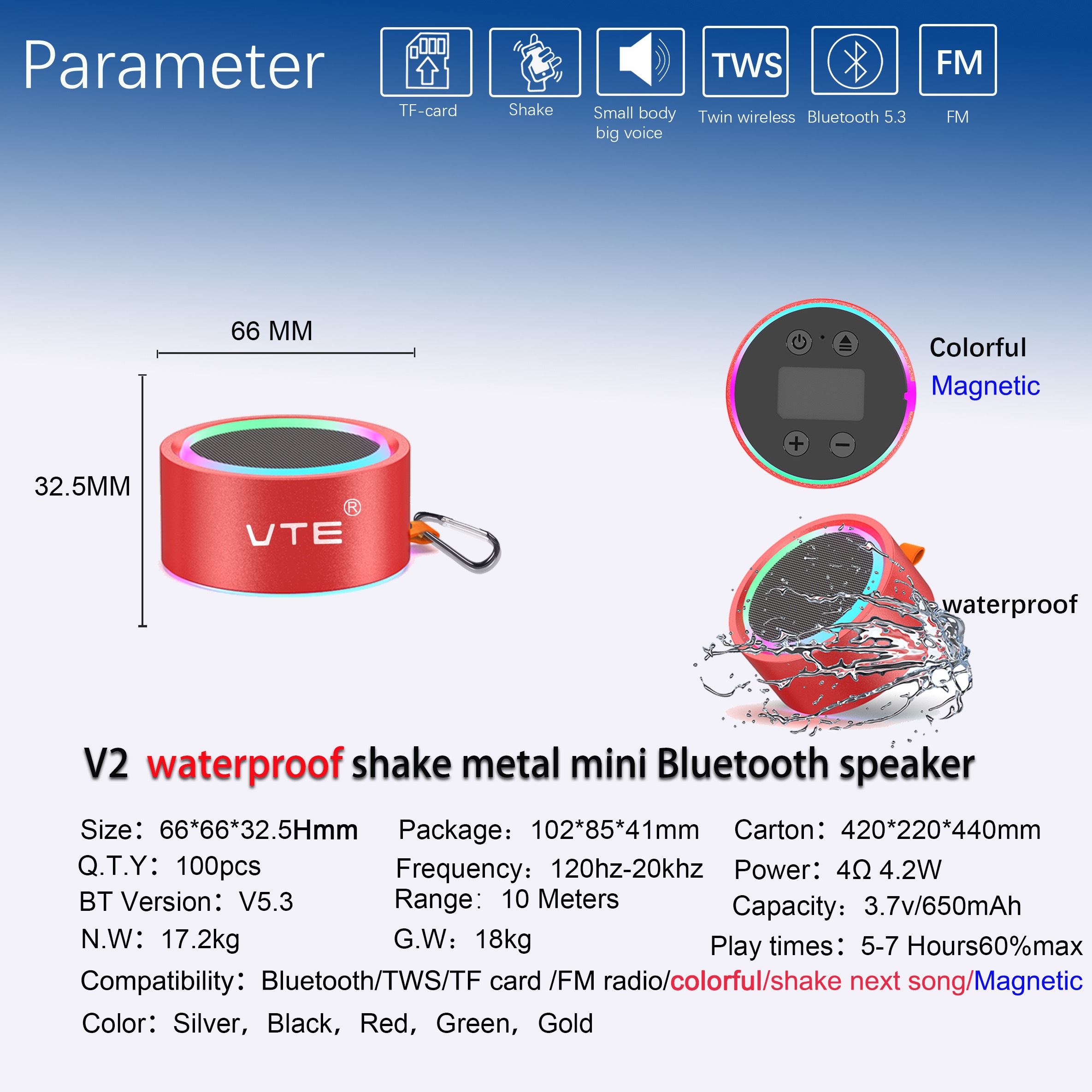 防水迷你蓝牙音箱,支持功能;蓝牙,TWS互联 ,FM收音机,彩色灯光,摇一摇下一首,磁吸
