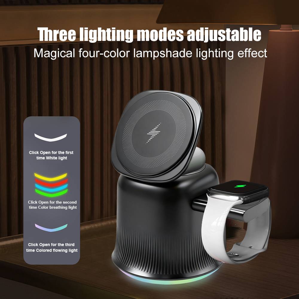 多功能支架磁吸无线充,可充手机、耳机、手表,产品底部带小夜灯功能,可做桌面手机支架