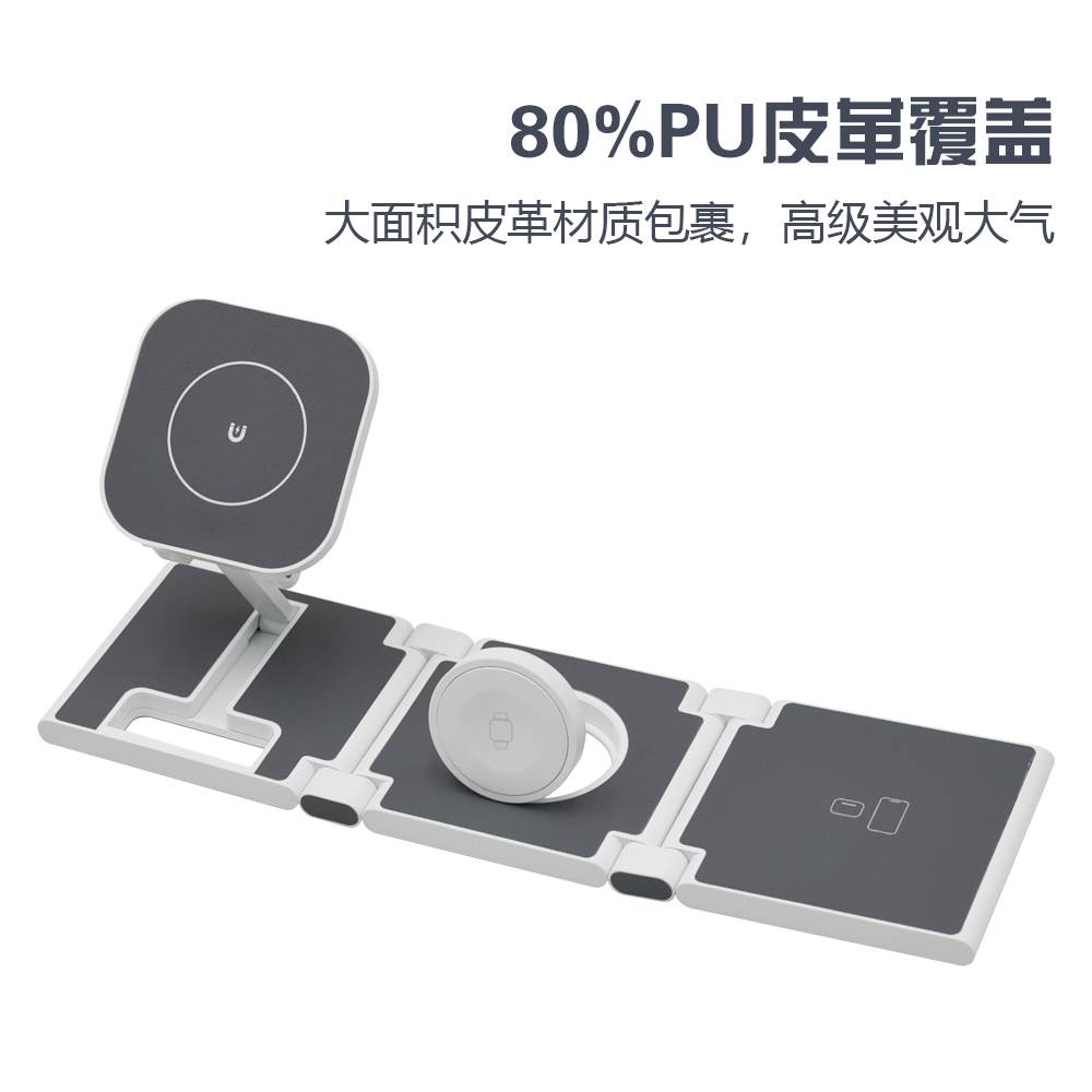 三合一折叠磁吸无线充,产品可充手机、耳机、手表,ABS加定制贴皮