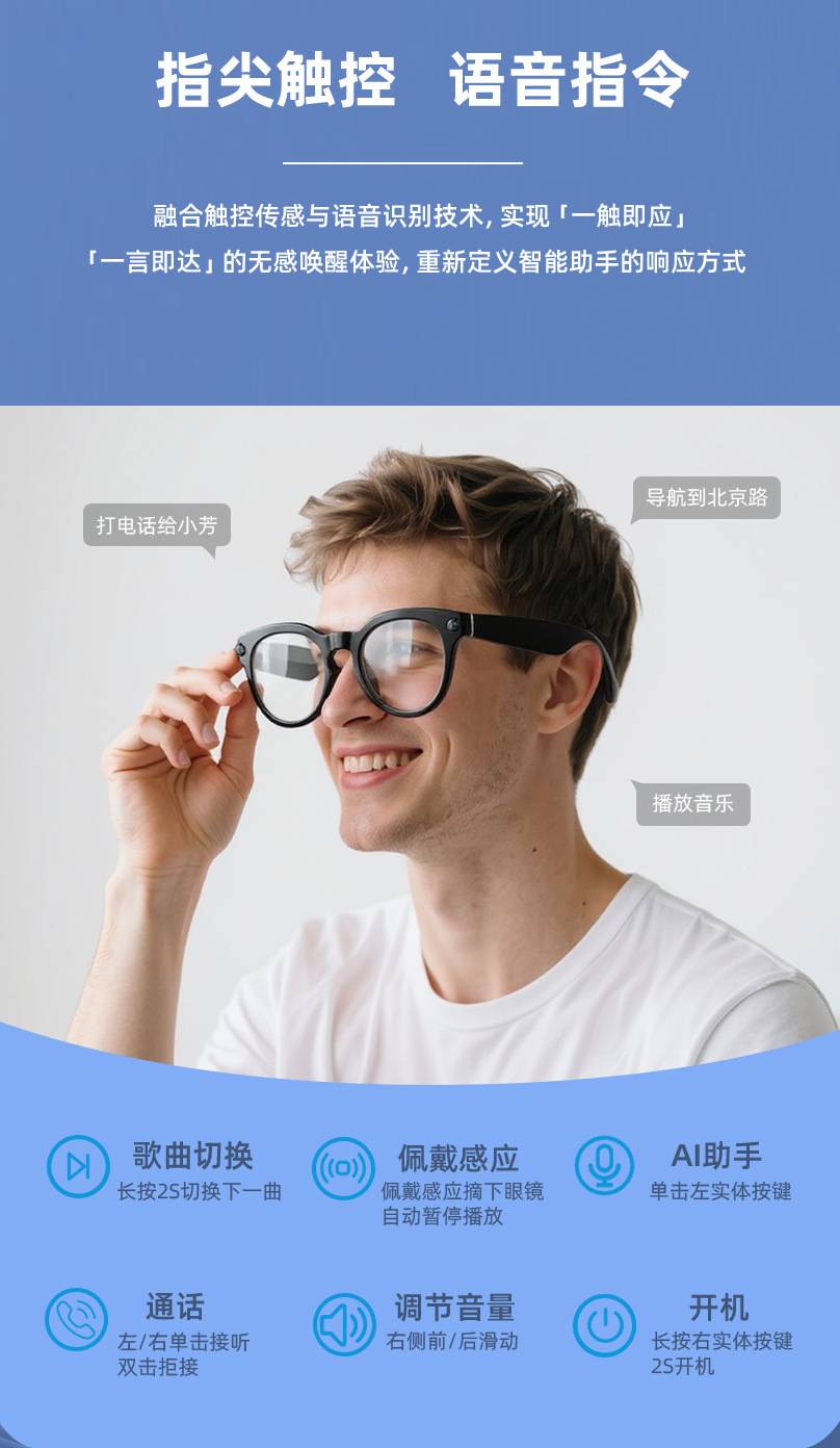 新款智能蓝牙眼镜双耳触摸控制听歌遥控拍照语音唤醒墨镜平光镜