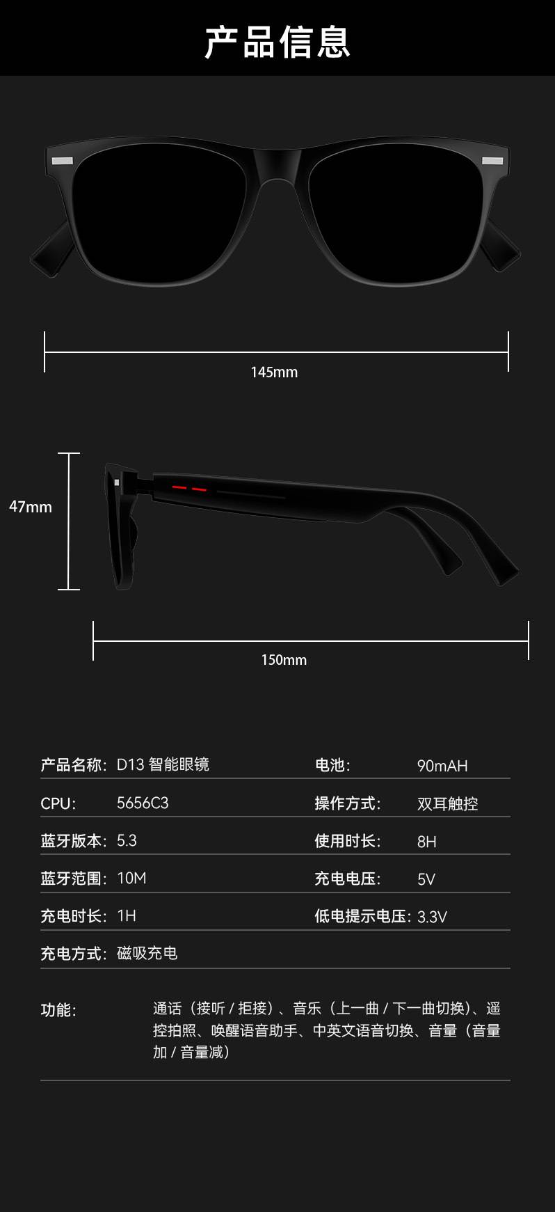 爆品新款D13蓝牙通话双耳触控偏光墨镜太阳镜智能蓝牙眼镜听音乐