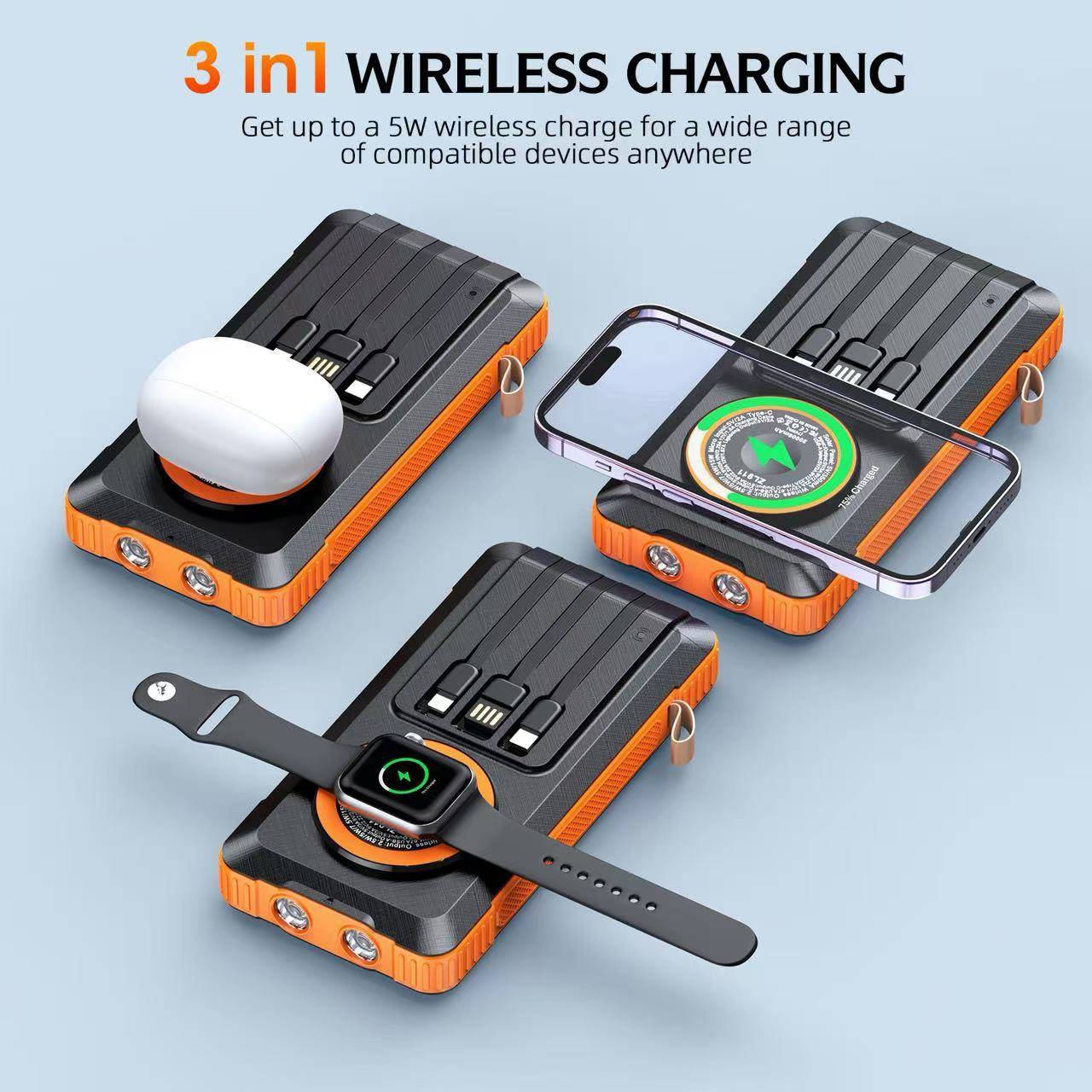 Solar powered wireless power bank with built-in cable, outdoor portable