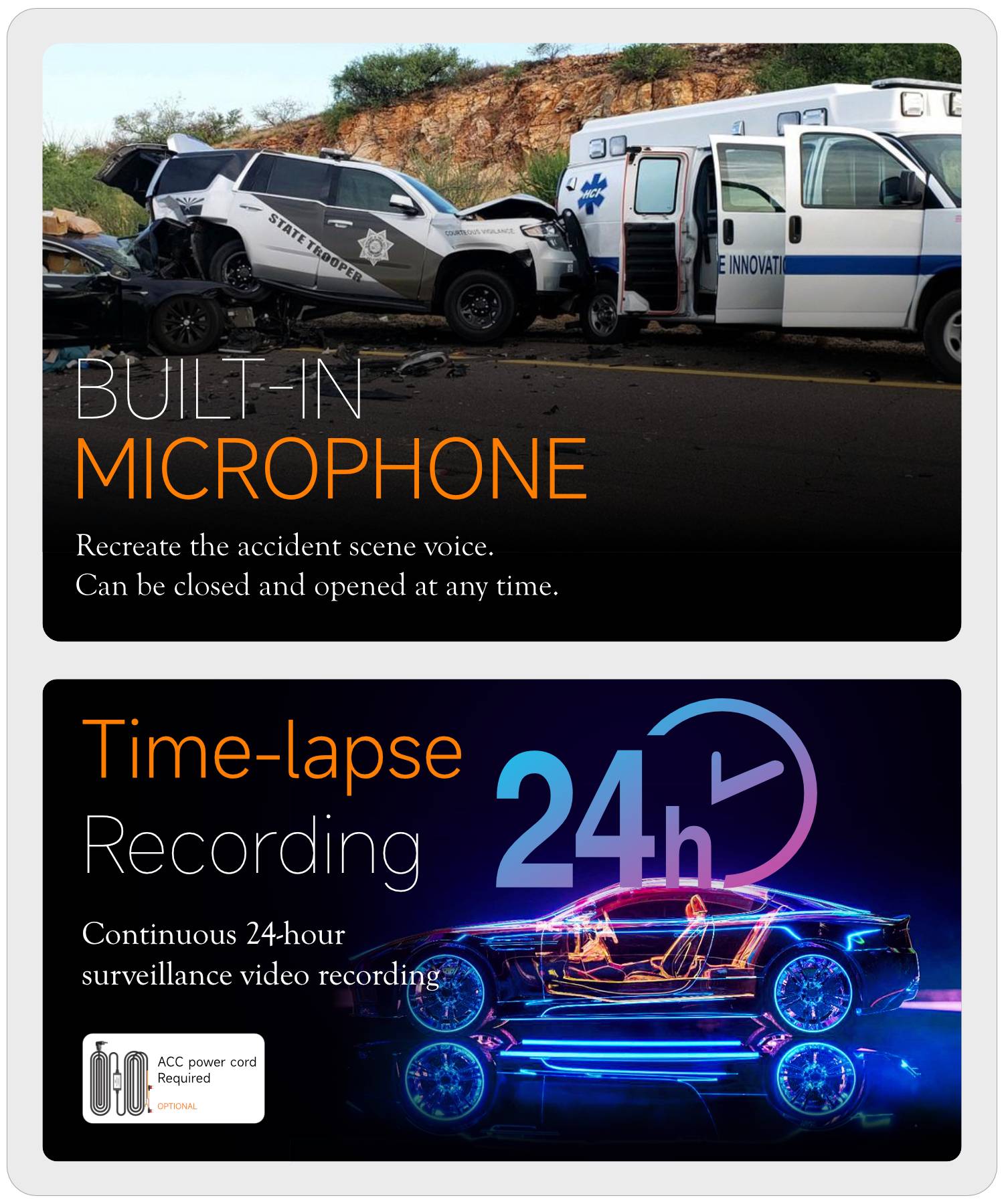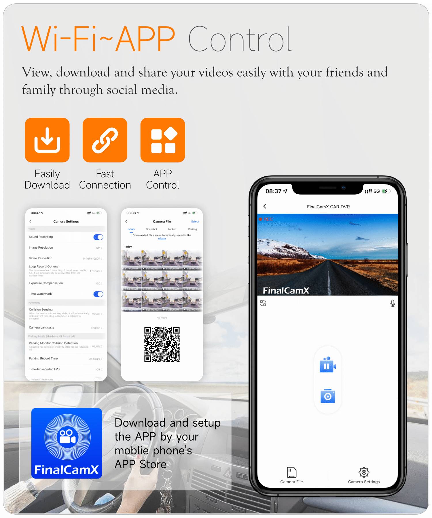 A313 Parking Surveillance Dash Cam with HD Night Vision, Wireless WiFi, and Dual Front/Front Cameras
